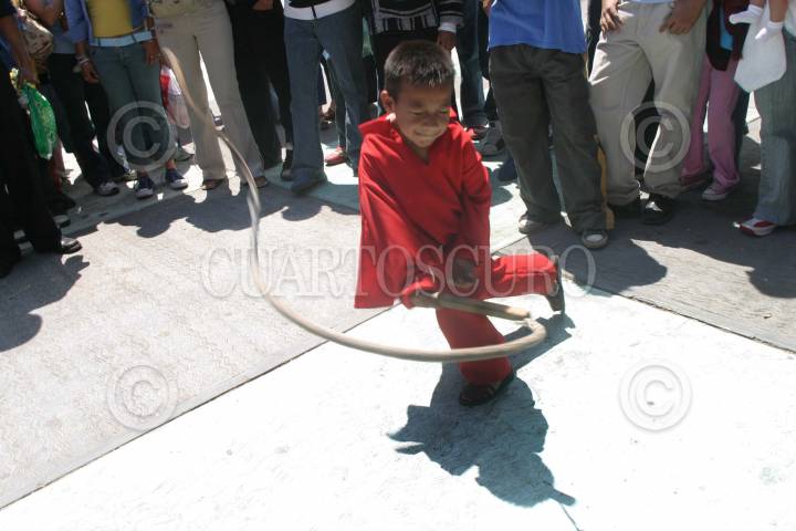 MEXICO D.F 26 MARZO 2005.- Un niño vestido de Judas pega con un chicote de cuero a un habitante de Cuajimalpa, como parte de la tradición de los Judas de Semana Santa en esta delegación. FOTO: Eunice Adorno/CUARTOSCURO.COM