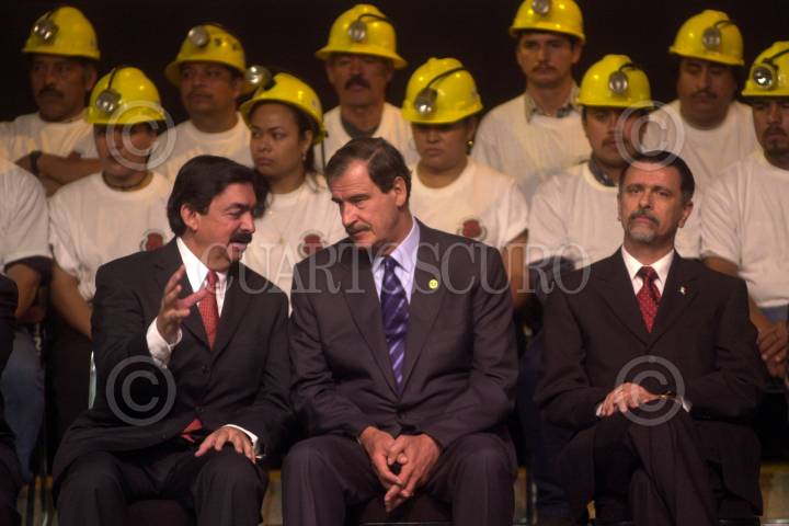 MEXICO D.F. 06MARZO2006.- ARCHIVO.- Imagen captada el 4 de mayo del 2004. Napoleón Gómez Urrutia, secretario general de trabajadores mineros, el presidente Vicente Fox y Carlos Abascal, Secretario del Trabajo durante la ceremonia de apertura de la XXXIII Convención General del Sindicato de Trabajadores Mineros y Metalurgicos. FOTO: Eunice Adorno/CUARTOSCURO.COM