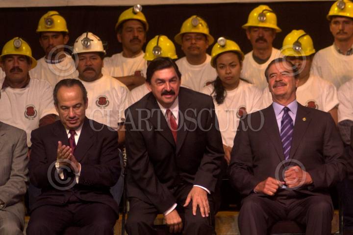 MEXICO D.F. 06MARZO2006.- ARCHIVO.- Imagen captada el 4 de mayo del 2004. Felipe Calderon Hinojosa, secretario de Energía, Napoleón Gómez, secretario general de trabajadores mineros y el presidente Vicente Fox durante la ceremonia de apertura de la XXXIII Convención General del Sindicato de Trabajadores Mineros y Metalurgicos. FOTO: Eunice Adorno/CUARTOSCURO.COM