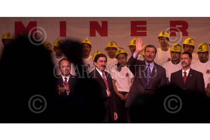 MEXICO D.F. 06MARZO2006.- ARCHIVO.- Imagen captada el 4 de mayo del 2004. Felipe Calderon Hinojosa, secretario de Energía, Napoleón Gómez, secretario general de trabajadores mineros, el presidente Vicente Fox y Carlos Abascal Carranza, Secretario del Trabajo durante la ceremonia de apertura de la XXXIII Convención General del Sindicato de Trabajadores Mineros y Metalurgicos. FOTO: Eunice Adorno/CUARTOSCURO.COM
