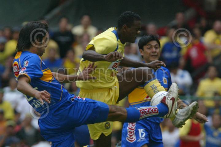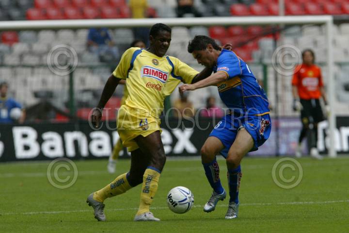 MEXICO, D.F. 31JULIO2005.- Kleber Boas, de las Aguilas del America se disputa el balon,con Sixto Peralta de los Tigres, durante su encuentro en el partido de Apertura 2005. FOTO: Sandra Perdomo \CUARTOSCURO.COM