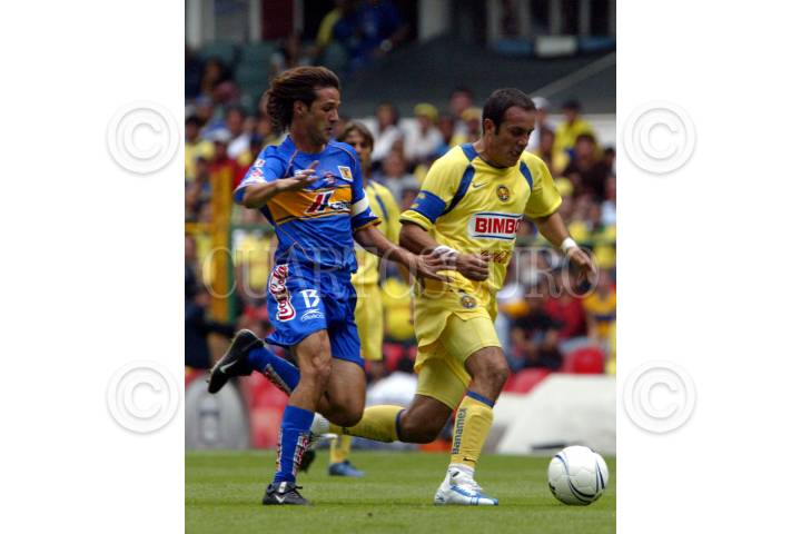 MEXICO, D.F. 31JULIO2005.- Antonio Sancho, de equipo de Tigres se disputa el balon con Cuauhtemoc Blanco, de las Aguilas del America, durante el partido de apertura 2005 en el Estadio Azteca. FOTO: Sandra Perdomo \CUARTOSCURO.COM