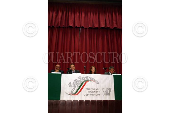 MEXICO D.F. 01 AGOSTO 2005.- Guillermo Bernal Miranda, jefe de Política Presupuestal, Alejandro Werner Wainfeld, jefe de la Unidad de Planeación de la Hacienda Pública, Isabel Suárez Mier, comunicación social, y Julio Aguilar, jefe de la Unidad de Política de Ingresos, durante el Informe sobre la situación económica, las finanzas y la deuda pública. FOTO: Sandra Perdomo/CUARTOSCURO.COM