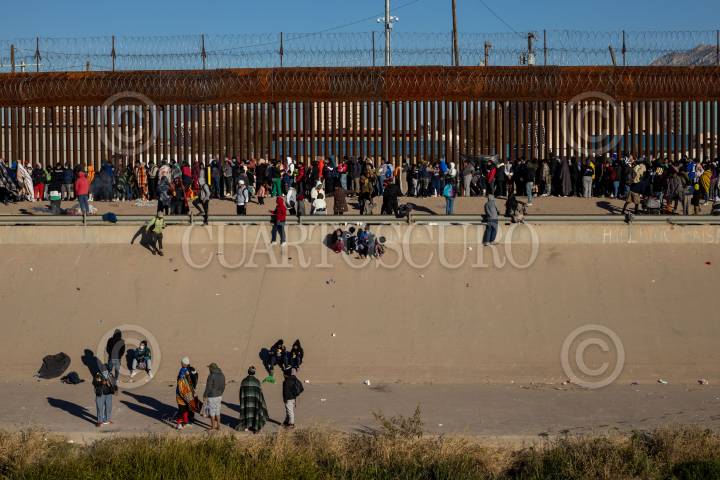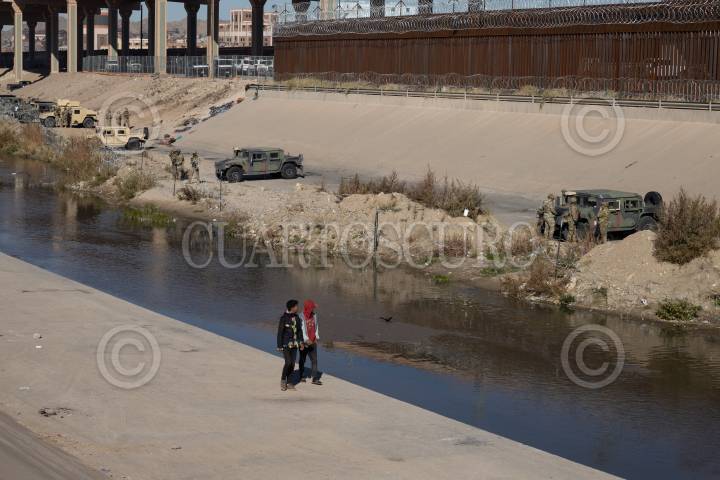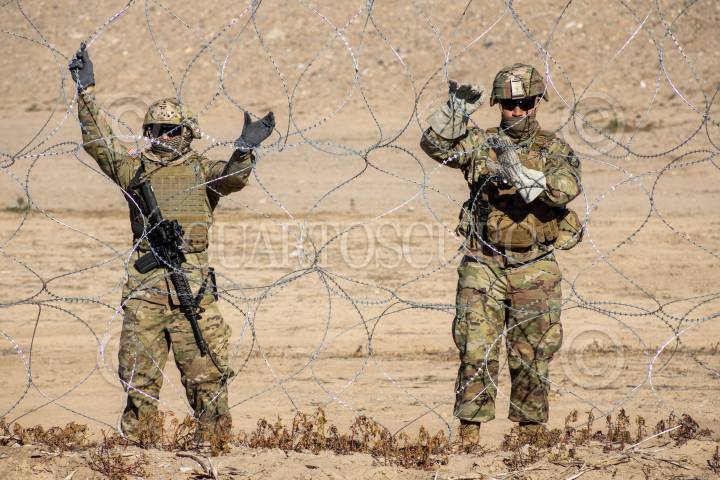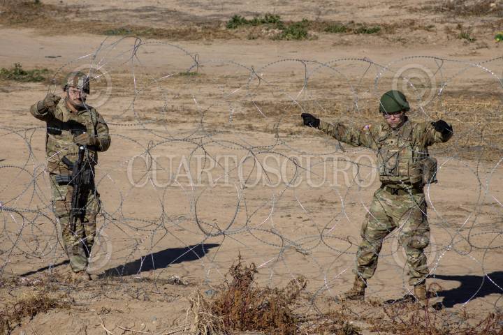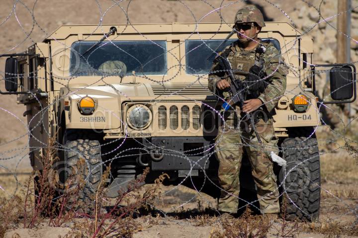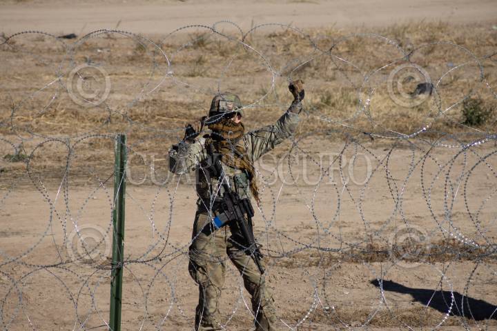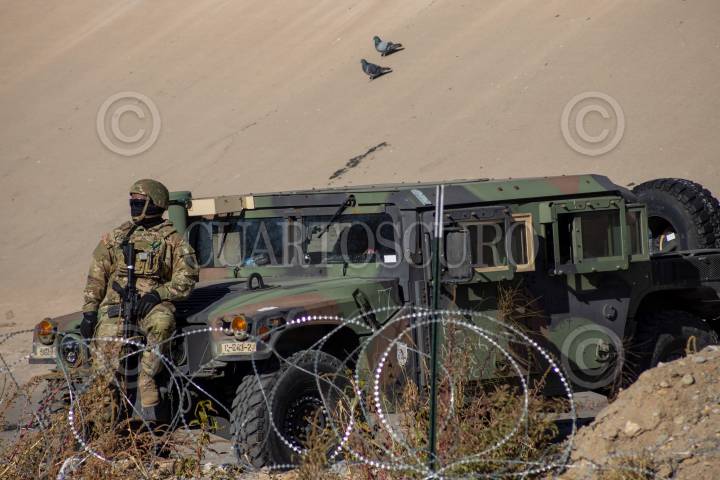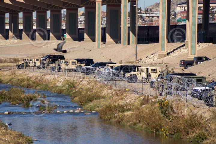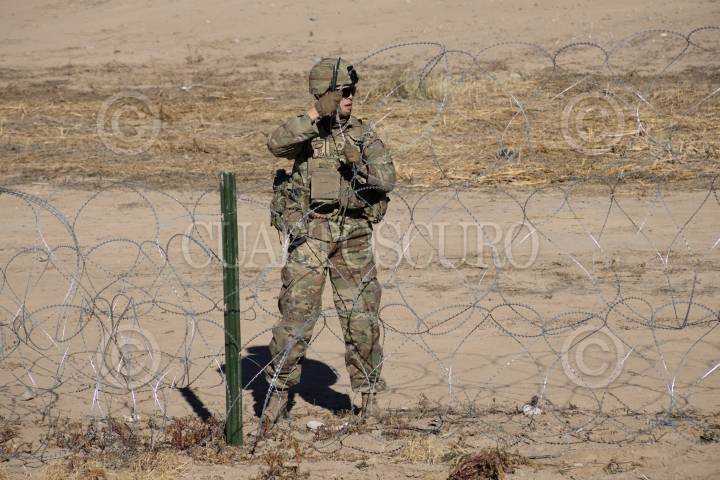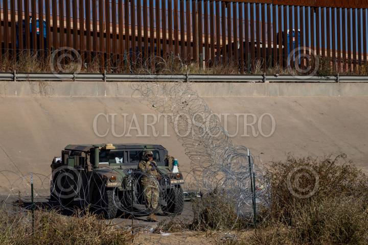 Militares estadounidense colocaron alambre de púas y vehículos militares a las orillas del Río Bravo para evitar la entrada de migrantes a territorio texano por Ciudad Juárez, Chihuahua.