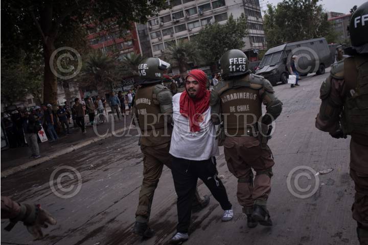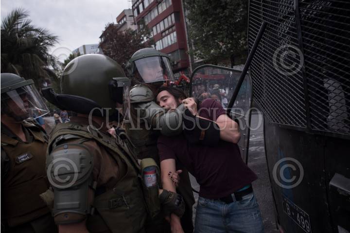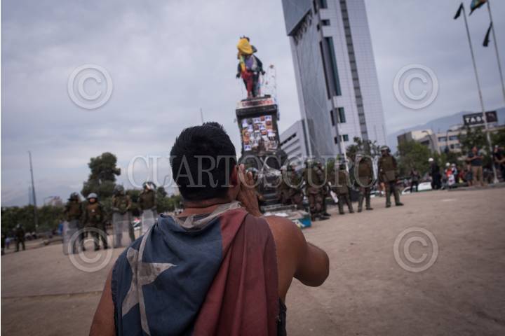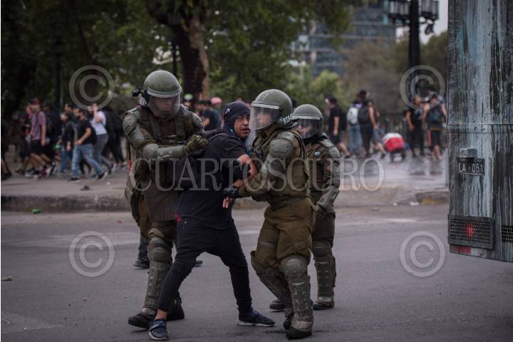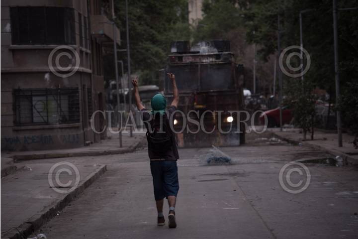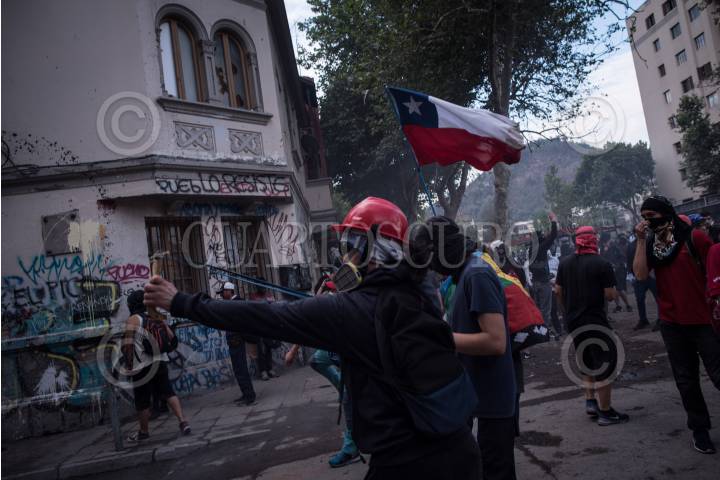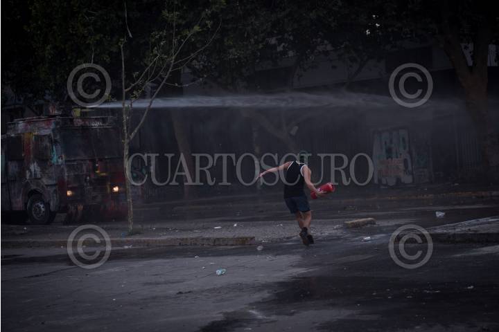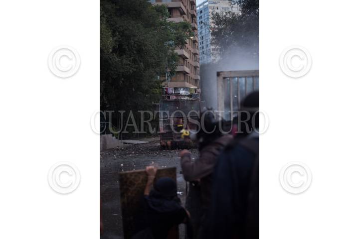 SANTIAGO, CHILE, 02DICIEMBRE2019.- A mas de 40 días desde que inició el estallido social en Chile, a causa del alza en las tarifas del metro, las protestas continúan en la capital del país. El descontento social que inició con movilizaciones estudiantiles se generalizó reivindicando otras problemáticas sociales. Cada día por la tarde, en las inmediaciones de la Plaza Italia, hoy bautizada Plaza de la Dignidad, jóvenes se enfrentan con los cuerpos policiaco llamados Carabineros. FOTO: PEDRO ANZA /CUARTOSCURO.COM