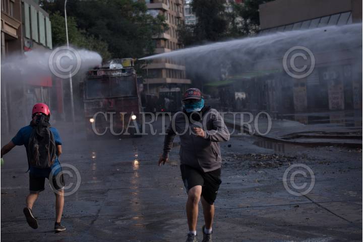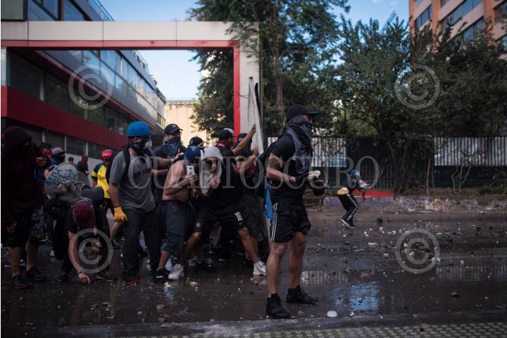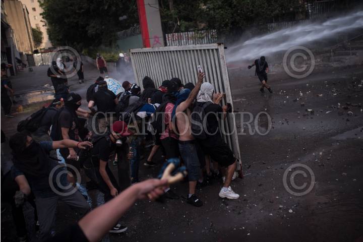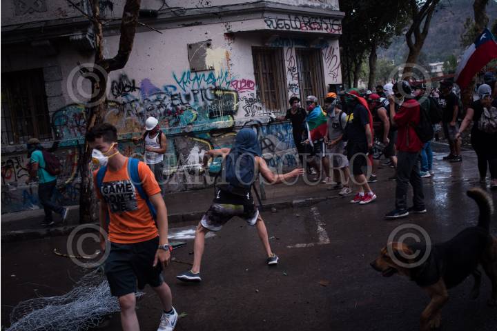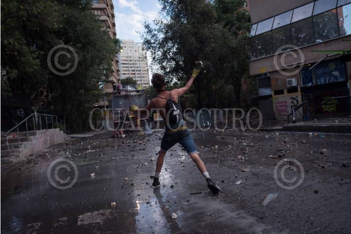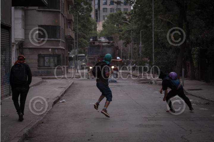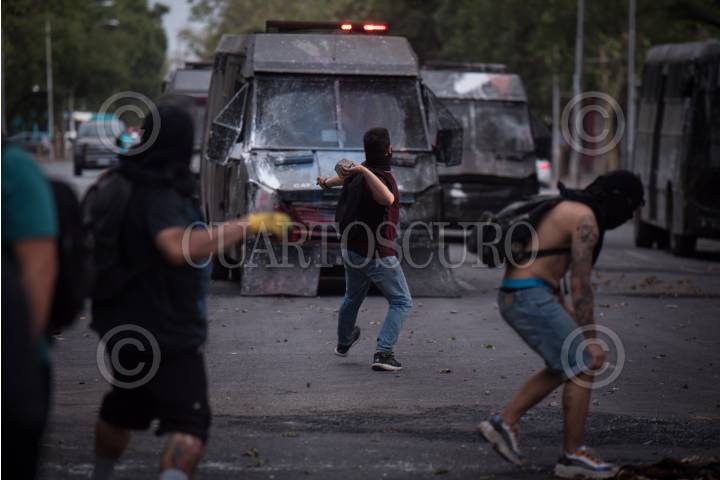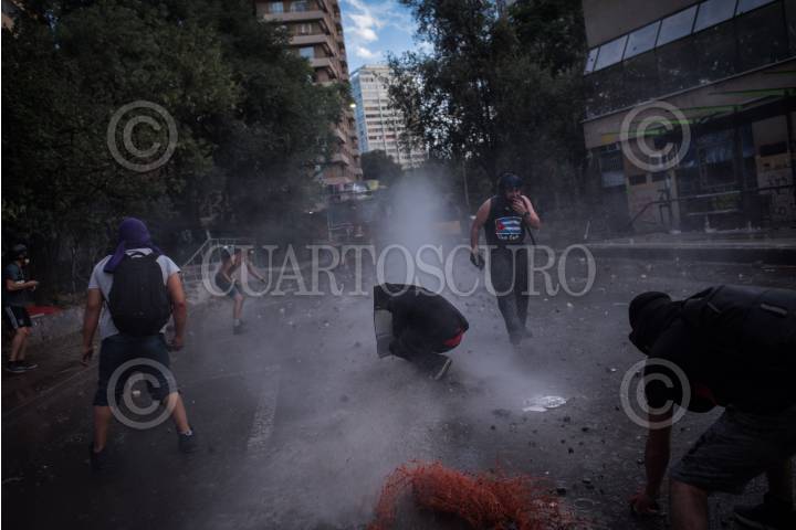SANTIAGO, CHILE, 28NOVIEMBRE2019.- A 40 días de que inició el estallido social en Chile, a causa del alza en las tarifas del metro, las protestas continúan en la capital del país. El descontento social que inició con movilizaciones estudiantiles se generalizó reivindicando otras problemáticas sociales. Cada día por la tarde, en las inmediaciones de la Plaza Italia, jóvenes se enfrentan con los cuerpos policiaco llamados Carabineros. FOTO: PEDRO ANZA /CUARTOSCURO.COM