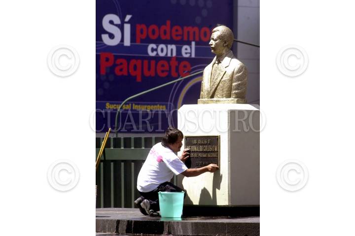 Un trabajdor limpia el busto de Luis Donaldo Colosio, en el CEN del PRI a casi 9 años de su muerte.FOTO: Oswaldo Ramírez/CUARTOSCURO.COM
