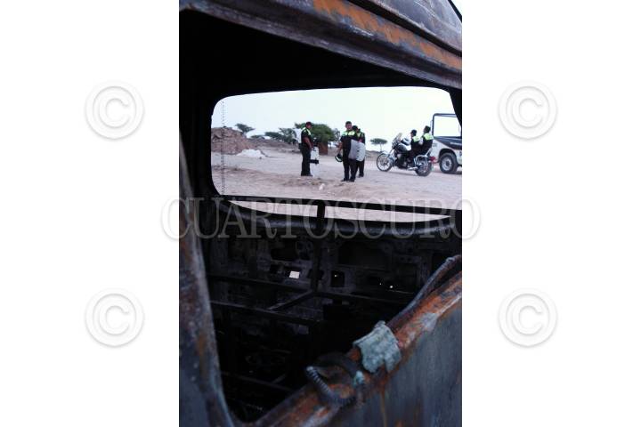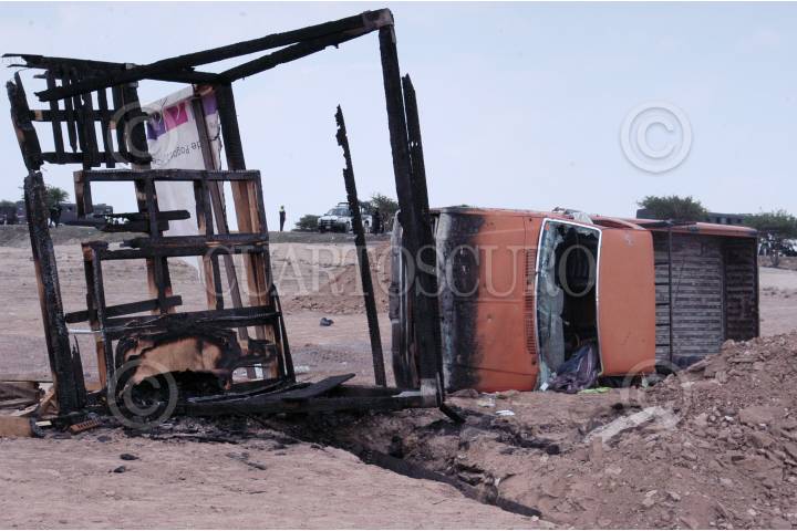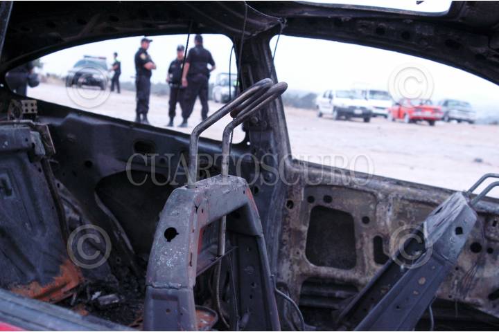 CUAUTITLÁN IZCALLI, ESTADO DE MÉXICO, 07ABRIL2010.- Ocho vehiculos dañados y quemados permanecen en el ejido de Guadalupe, luego del enfrentamiento que sostuvieron ejidatarios de San Francisco Tepojaco y miembros de la organización priísta Antorcha Campesina, porque los primeros responsabilizan a los segundos de invadir sus tierras. En tanto, policías estatales resguardan el sitio a fin de evitar otro segundo enfrentamiento. FOTO: MARIO NULO/CUARTOSCURO.COM