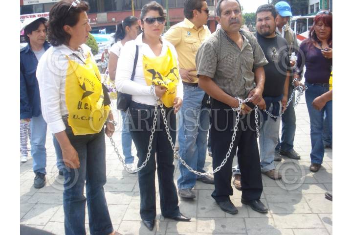 ECATEPEC, ESTADO DE MÉXICO, 13ABRIL2010.- Al menos 37 familias desalojadas del predio La Glorieta se encadenaron de las manos y lanzaron consignas contra el alcalde de Ecatepec, Eruviel Ávila Villegas y el Director de Seguridad Pública Municipal, José Luis Flores Gómez, a quienes acusan de despojo y abuso de autoridad. Cabe destacar que las 37 familias fueron desalojadas del predio la Glorieta el pasado 31 de marzo, y ante el abuso se se manifestaron frente al Palacio Municipal donde se encadenaron de las manos en protesta de contra el edil priísta y el titular de la dependencia policiaca. Los manifestante señalan a Ávila Villegas y Flores Gómez, de violar tres amparos otorgados a tres de las familias desalojadas el día señalado, cuando también, los policías detuvieron a dos ancianos que golpearon y abandonaron en un centro de atención para drogadictos. FOTO: MARIO NULO/CUARTOSCURO.COM