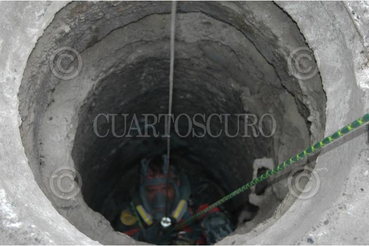 NEZAHUALCÓYOTL, ESTADO DE MÉXICO, 30OCTUBRE2010.- Personal del Sistema de Agua de la Ciudad de México monitorean el drenaje de esta localidad con cámara y aparatos de laboratorio, luego de que ayer jueves hubo un presunto asentamiento de tierra en la zona que afectó a 140 viviendas de la zona, y que presuntamente fue por un estallido debido a la acumulación de gases por el basurero "Neza 2" que se encuentra a unos metros de la zona habitacional. Un buzo se introdujo en el drenaje de 1.83 metros de diámetro, a fin de realizar la inspección. Los trabajos se realizan en coordinación con la Comisión de Aguas del Estado de México y el Sistema de Agua del Distrito Federal. Esto en de Avenida 2 Árbolitos, en la colonia Benito Juarez. FOTO: MARIO NULO/CUARTOSCURO.COM