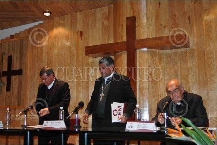 CUAUTITLÁN IZCALLI, ESTADO DE MÉXICO, 11NOVIEMBRE2010.- No existe fuero religioso por los procesos que enfrentan el Cardenal Juan Sandoval Iñiguez y el obispo de Ecatepec, Onésimo Cepeda Silva, el primero por un proceso civil y el segundo por acusado de fraude, aseguraron los obispos Rutilo Muñoz Zamora, de Coatzacoalcos; Víctor René Rodríguez Gómez, subsecretario general de la Conferencia del Episcopado Mexicano (CEM); y Lucas Martínez Lara, de Matehuala, en conferencia de prensa en la Casa del Lago de la Conferencia del Episcopado Mexicano (CEM) donde celebran los obispos mexicanos su XC Asablea Plenaria. FOTO: MARIO NULO/CUARTOSCURO.COM