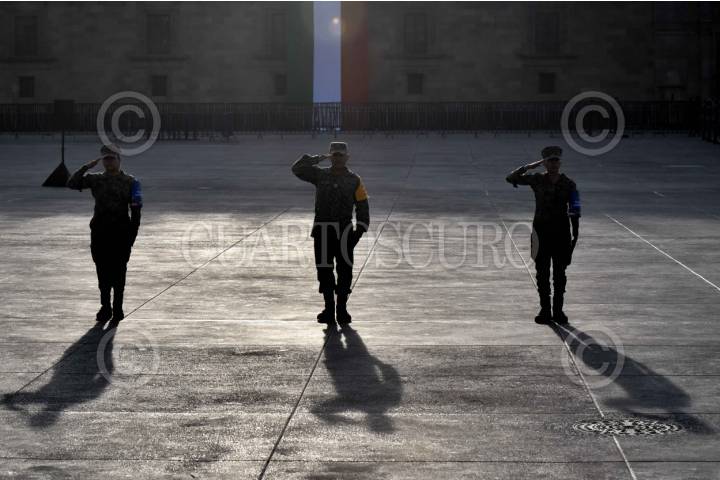 CIUDAD DE MÉXICO, 19SEPTIEMBRE2025.- Integrantes de las fuerzas armadas durante la ceremonia de izamiento de bandera nacional a media asta en memoria de las víctimas de los sismos de 1985 y 2017, realizada en el zócalo capitalino. FOTO: MARIO JASSO/CUARTOSCURO.COM