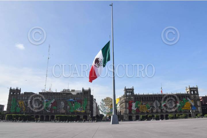 CIUDAD DE MÉXICO, 19SEPTIEMBRE2025.- Izamiento de bandera nacional a media asta en memoria de las víctimas de los sismos de 1985 y 2017, realizada en el zócalo capitalino. FOTO: MARIO JASSO/CUARTOSCURO.COM