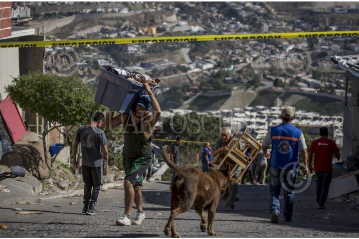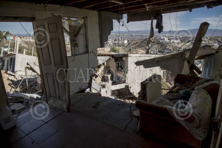 TIJUANA, BAJA CALIFORNIA, 05FEBRERO2018.- Un deslizamiento de tierra ocasionó afectaciones a 80 familias residentes de la colonia Lomas del Rubí, en la delegación San Antonio de los Buenos. Los damnificados tuvieron que desalojar sus viviendas colapsadas tras los movimientos de tierra que se han presentado. De acuerdo a información oficial el colapso y agrietamiento del cerro comenzó el pasado el 19 de enero y fue provocado por un movimiento de tierra que realizó una constructora, provocando la desestabilización del talud, por lo que se inició una mesa de trabajo para establecer la reparación del daño. FOTO: CHRISTIAN SERNA /CUARTOSCURO.COM