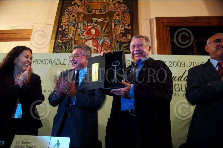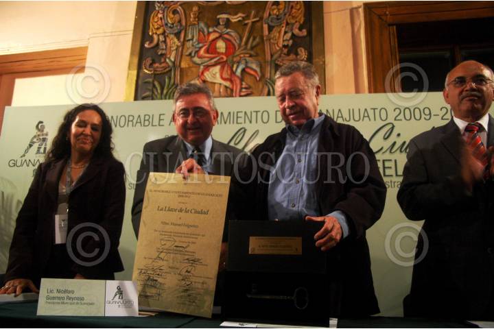 GUANAJUATO, GUANAJUATO, 30OCTUBRE2009.- Manuél Felguérez, artísta plástico, zacatecano, recibió esta noche las llaves de la ciudad de Guanajuato con la representación de su Presidente Municipal, Nicéforo Guerrero Reynoso, Lidia Camacho, Directora del Festival Internacional Cervantino, y Arturo Lara López, Rector General de la Universidad Autónoma de Guanajuato. FOTO: DAVID BOLAÑOS/CUARTOSCURO.COM
