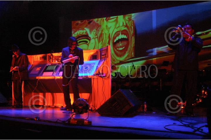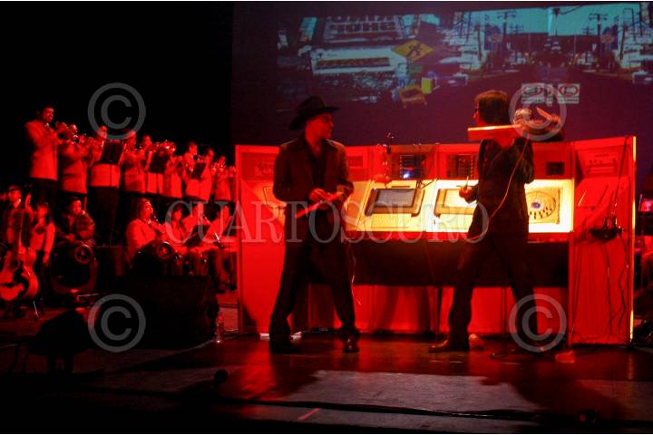 GUANAJUATO, GUANAJUATO, 02NOVIEMBRE2009.- La explanada de la Alhóndiga de granaditas vibró con el sonído de Nortec, ahora Tijuana Sound Machine quién compartió el escenario con la Internacional Banda de Música del Estado de Zacatecas, en la clausura del XXXVII Festival Internacional Cervantino. FOTO: DAVID BOLAÑOS/CUARTOSCURO.COM