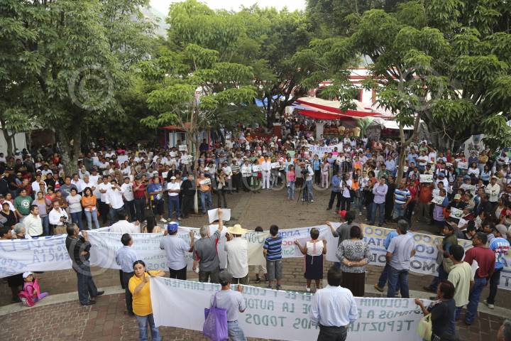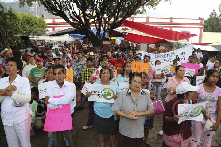 TEPOZTLÁN, MORELOS 28JULIO2013.- Grupos que apoyan el proyecto de ampleación de la autopista La pera-Cuautla, marcharon hasta el zócalo de tepoztlán donde se encontraban el grupo antagonico que desaprueba dicho proyecto, esto generó ambiente tensión en el centro de dicha localidad. FOTO: ALMA LAFAYET /CUARTOSCURO.COM