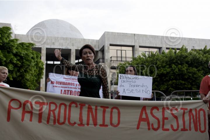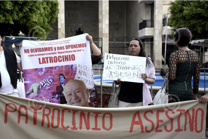 TUXTLA GUTIÉRREZ, CHIAPAS, 13AGOSTO2018.- Integrantes de la comunidad LGBT de Tuxtla, manifestaron su repudio en las afueras del Congreso del Estado, por la imposición de la medalla Miguel Álvarez del Toro, que el gobierno de Chiapas otorgó al ex gobernador, Patrocinio González Blanco Garrido. Entre gritos y consignas consideraron al homenajeado como uno de los principales involucrados en los homicidios de travestis y periodistas durante su periodo gubernamental de 1991 a 1993. FOTO: JACOB GARCÍA /CUARTOSCURO.COM