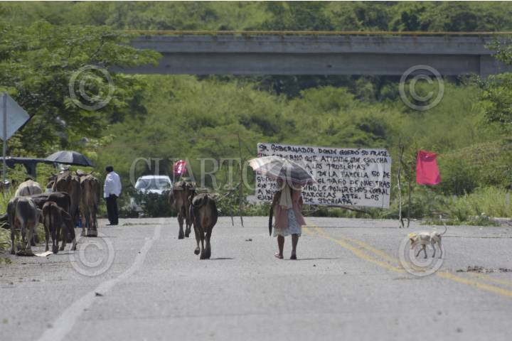 SUCHIAPA, CHIAPAS, 27AGOSTO2018.- Ejidatarios del tramo 50 del municipio de Suchiapa, bloquearon la carretera para exigir al gobierno de Manuel Velasco el pago por las tierras adquiridas para la construcción del nuevo libramiento sur. FOTO: JACOB GARCÍA /CUARTOSCURO. COM