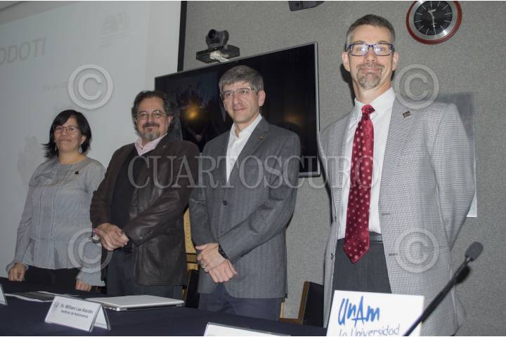 CIUDAD DE MÉXICO, 30JUNIO2017.- Yilen Gómez, Jesús González, William Lee, y Alan Watson Foster, profesores del Instituto de Astronomía de la Universidad Nacional Autónoma de México (UNAM) presentó el nuevo proyecto denominado Deca-Degree Optical Transient Imager (“DDOTI”, por sus siglas en inglés) instalado en el Observatorio Astronómico Nacional en la sierra de San Pedro Mártir en Baja California. En una colaboración entre México, Estados Unidos y Francia, habrá un conjunto de telescopios que se dedicarán a localizar el lugar en el cielo en donde suceden los fenómenos más energéticos del Universo. FOTO: SELENE PACHECO /CUARTOSCURO.COM