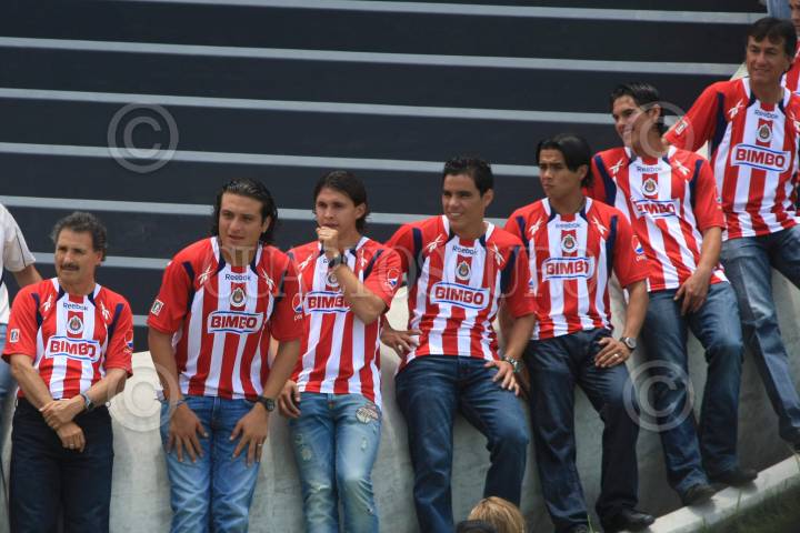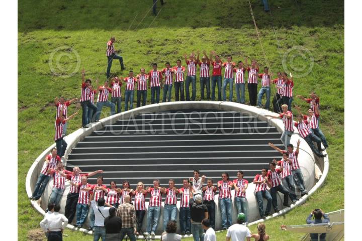 GUADALAJARA, JALISCO, 19JULIO2010.- El plantel de Chivas de Guadalajara se tomó la foto oficial de cara al Torneo Apertura 2010 del fútbol mexicano, a las afueras de su nuevo estadio. El lugar de la sesión fotográfica fue en la explanada, junto a una rejilla de ventilación donde fueron colocados los jugadores. Además del plantel y cuerpo técnico, el dueño del equipo, Jorge Vergara y su esposa Angélica Fuentes, posaron junto con el conjunto rojiblanco. FOTO: JOSÉ MARIA MARTÍNEZ/CUARTOSCURO.COM