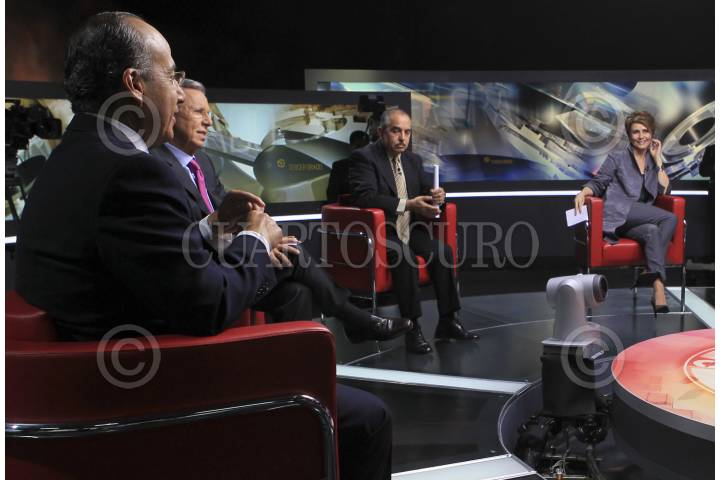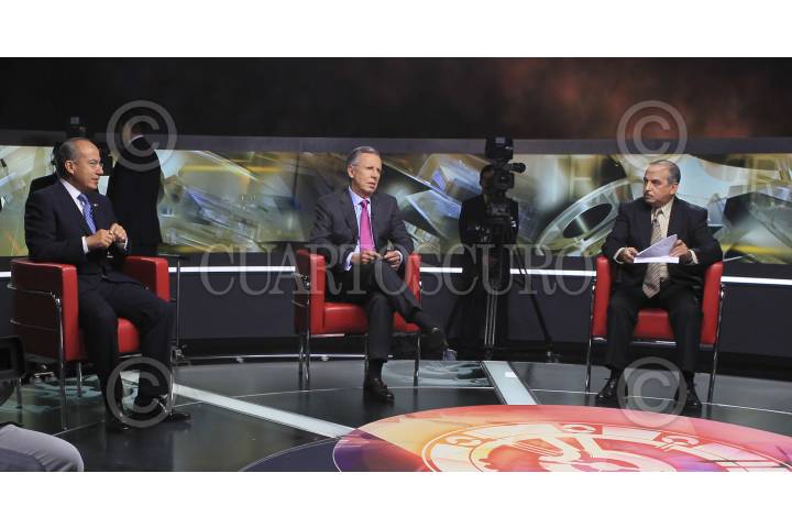 MÉXICO, D.F., 28MARZO2012.- Felipe Calderón Hinojosa, presidente de México, fue entrevistado en el programa "Tercer Grado", conducido por Leopoldo Gómez, vicepresidente de Noticieros de Televisa, y en el que participan los periodistas Victor Trujillo, Adela Micha, Carlos Loret de Mola, Ciro Gómez Leyva, Joaquin López Dóriga, Carlos Marín y Denisse Maerker. El programa será transmitido la noche de este miércoles por el Canal 2. FOTO: ESPECIAL TELEVISA /CUARTOSCURO.COM