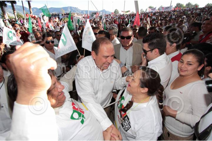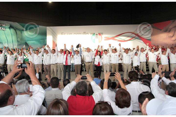 SALTILLO, COAHUILA, 09MARZO2013.- Los candidatos a alcaldes del Partido Revolucionario Institucional de los 38 municipios de Coahuila, tomaron protesta esta tarde ante aproximadamente 5 mil militantes y teniendo como invitados al Gobernador del Estado, Rubén Moreira Valdez y el dirigente nacional del PRI, Cesar Camacho Quiróz, en el marco de la XX Sesión Extraordinaria del Consejo Estatal del PRI. FOTOS: KARLA ITZEL RUIZ/CUARTOSCURO.COM
