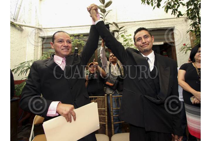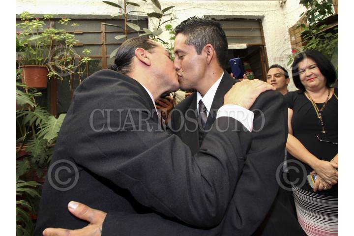 SALTILLO, COAHUILA, 20 SEPTIEMBRE 2014.- Jesús Fernando Cobarruvias Monsiváis y Luis Alberto Reyes Soto, se convirtieron en la primera pareja del mismo sexo en contraer matrimonio igualitario en Coahuila; tras la aprobación de las reformas a los Códigos Civil y Procesal Civil, aprobadas por el Congreso local, las cuales entraron en vigor el pasado primero de septiembre. El enlace tuvo lugar en la Oficialía del Registro Civil Número 2, ubicada en la zona centro de Saltillo. Coahuila es la segunda entidad del país, después del Distrito Federal, que autoriza las bodas entre personas del mismo sexo. FOTO: KARLA ITZEL RUIZ /CUARTOSCURO.COM