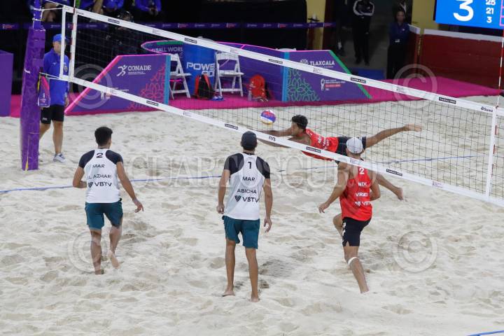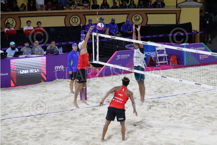 APIZACO, TLAXCALA, 11OCTUBRE2023.- La Dupla Mexicana Juan Virgen y Miguel Sarabia, en la rama varonil de voleibol de playa, cayó frente a los norteamericanos Chase Evans y Miles Budinger, por parciales de 24-21 y 21-19, en la Plaza Rodolfo Rodríguez “El Pana” de Apizaco. Mexico se despide del campeonato Munidial de Voleibol de Playa Tlaxcala 2023. FOTO: ESSENE HERNANDEZ/CUARTOSCURO.COM