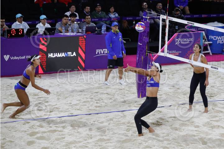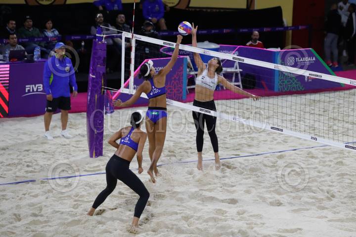 TLAXCALA, TLAXCALA, 13OCTUBRE2023.- Las jugadoras de Usa ( Hughes y Cheng) se enfrentan a las Brasileñas (Taina y Victoria) en los cuartos de Final del Campeonato Mundial de Voleibol de Playa 2023, para calificar a los juegos Olimpicos Paris 2024. FOTO: ESSENE HERNANDEZ