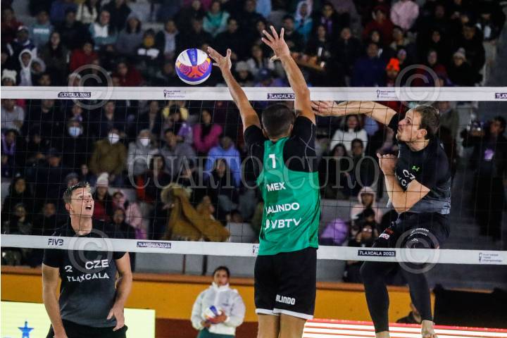 TLAXCALA, TLAXCALA, 13OCTUBRE2023.- Los jugadores de Noruega (Mo, A y Sorum) se enfrentan a Republica Checa (Perusic y Schweiner) en los cuartos de Final del Campeonato Mundial de Voleibol de Playa 2023, para calificar a los juegos Olimpicos Paris 2024. FOTO: ESSENE HERNANDEZ