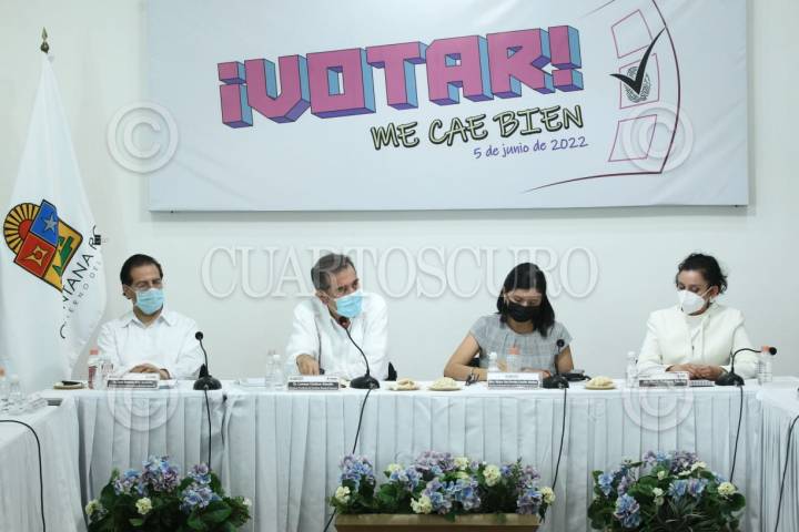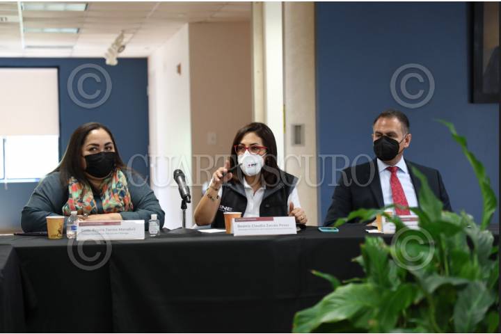 José Roberto Ruíz Saldaña; Lorenzo Córdova; Dania Ravel Cuevas y José Luis Ashane Bulos durante la presentación el Protocolo para la atención a víctimas y la elaboración del análisis de riesgo en los casos de Violencia Política en Razón de Género.