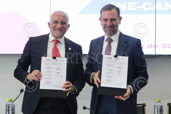 Hugo Andreas Setzer y Lorenzo Córdova Vianello durante la firma de convenio entre el INE y la CANIEM.