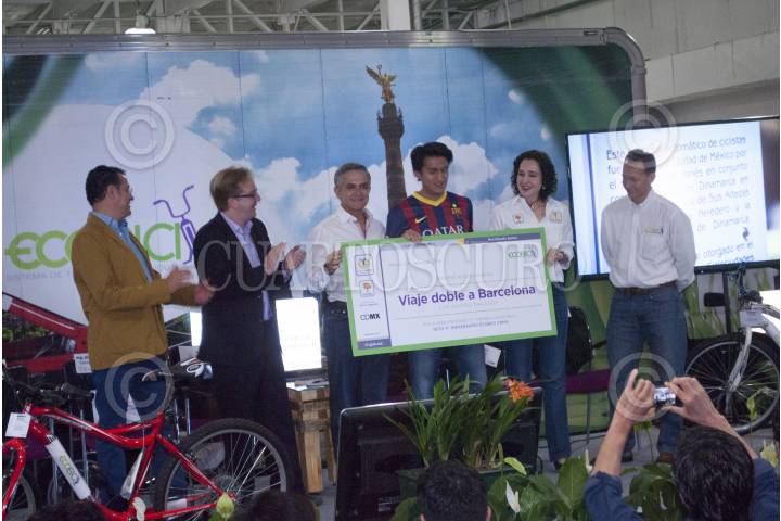 MÉXICO, D.F., 08MARZO2014.- Miguel Ángel Mancera, jefe de Gobierno del Distrito Federal, y Tanya Müller, secretaria del Medio Ambiente del Distrito Federal, encabezaron la ceremonia en donde se entregaron los premios del Reto Ecobici. Al primer lugar se entregó un vale para un viaje doble a Barcelona. FOTO: MITZI BLANQUET / CUARTOSCURO.COM