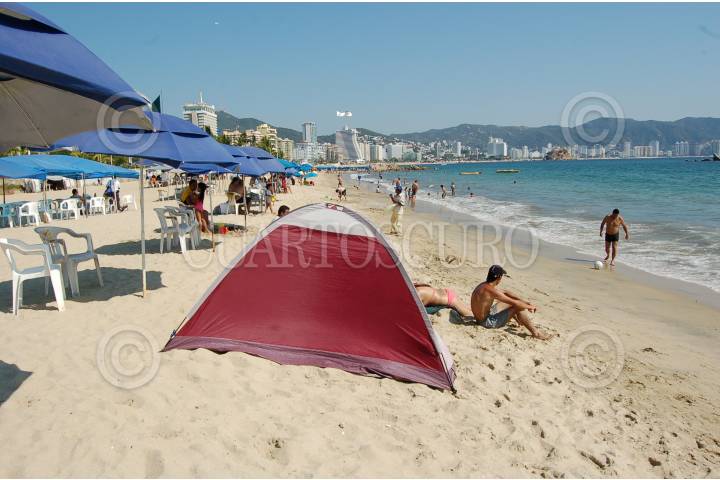 ACAPULCO, GUERRERO, 13DICIEMBRE2009.- Turistas del distrito federal prefieren ahorrarse el hospedaje en hoteles de lujo de Acapulco y descansan en su casa de campaña instalada sobre la arena y con vista al mar. FOTO: MARINO D. VALDEZ/CUARTOSCURO.COM