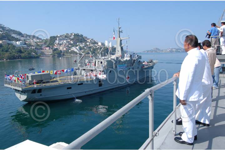 ACAPULCO, GUERRERO, 27ENERO2010.- Felipe Calderón Hinojosa, Presidente de México, durante la despedida del buque auxiliar multiproposito Arm Zapoteco AMP-02 en operación de ayuda humanitaria al pueblo de Haití. FOTO: MARINO D. VALDEZ/CUARTOSCURO.COM