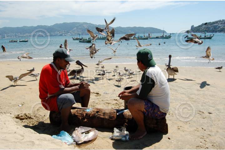 ACAPULCO, GUERRERO, 15FEBRERO2010.- Pescadores de la playa Homitos, arrojan viseras de pez a gaviotas que se encuentran en la playa. FOTO: MARINO D. VALDEZ/CUARTOSCURO.COM