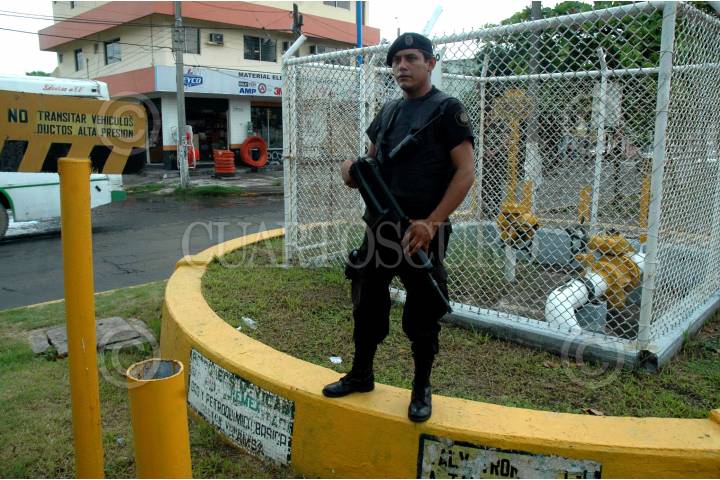 VERACRUZ, VERACRUZ, 11AGOSTO2007.- Después de los atentados que se registraron el día de ayer, instalaciones de PEMEX en la zona centro del estado son resguardadas por elementos del Instituo de policia auxiliar (IPAX) entre las cuales están las válvula del gasoducto que cruzan la ciudad de norte a sur sobre la avenida Cuauhtémoc. FOTO: ISAAC AGUILAR/CUARTOSCURO.COM