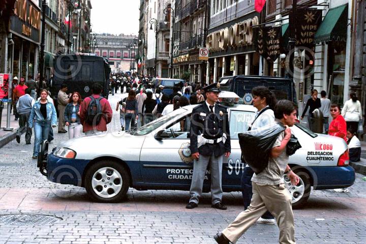 Polícias de la Ciudad de México, se encargan de revisar al a toda la gente que entra al Zócalo, para guradar el orden para el festejo de est noche. FOTO: Ricardo Hernández/CUARTOSCURO.COM
