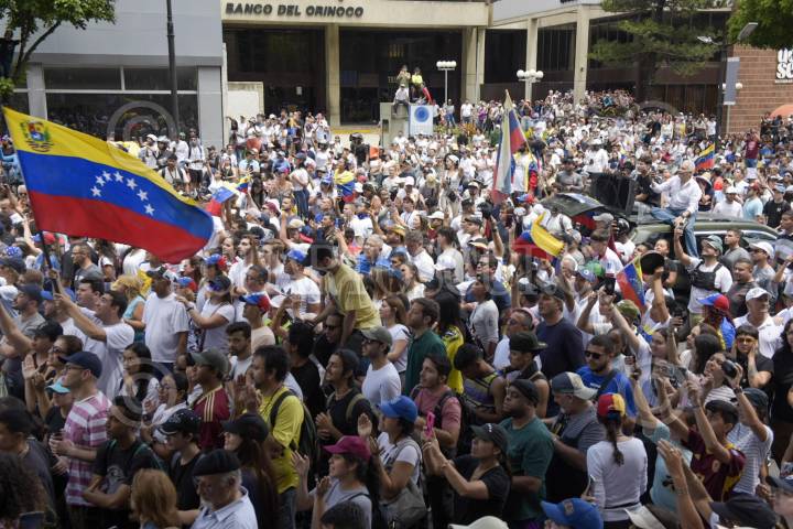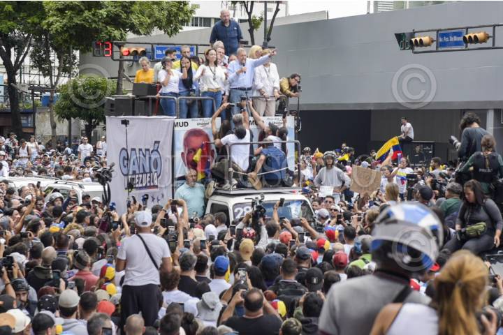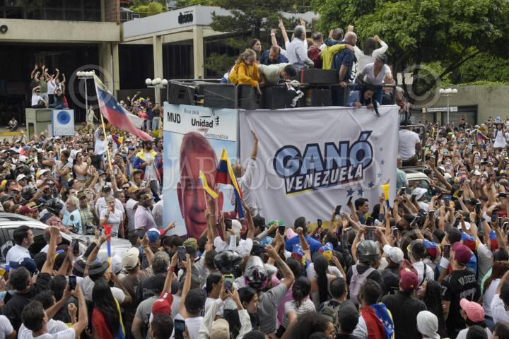 CARCAS, VENEZUELA, 30JULIO2024.- El candidato a la presidencia de Venezuela, Edmundo Gonzales Urrutia y María Corina Machado, los dos principales líderes de la oposición al gobierno venezolano de Nicolás Maduro, se manifestaron durante un acto multitudinario a las afueras del Programa de lAs Naciones Unidas para el Desarrollo (PNUD), en Caracas. Durante el acto, ambos hablaron ante miles de seguidores y aseguraron tener pruebas de las actas de votaciones que los dan como los ganadores de la contienda electoral. FOTO: ISRAEL FUGUEMANN /CUARTOSCURO.COM