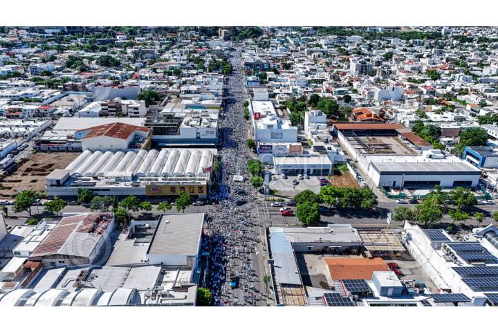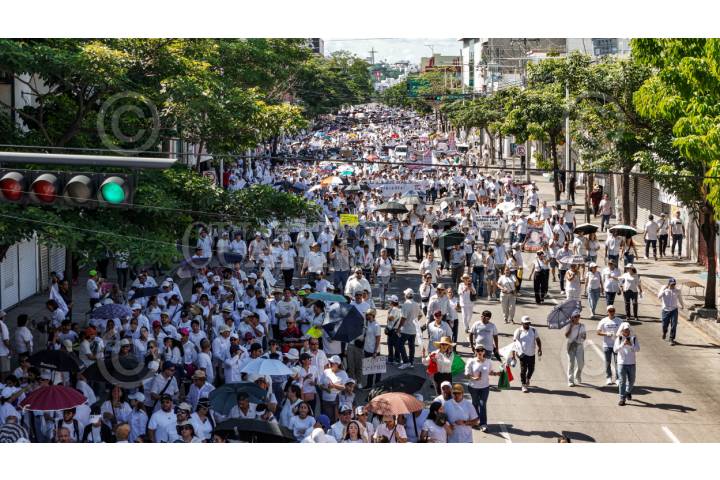 CULIACÀN, SINALOA, 09SEPTIEMBRE2025.- El 9 de Septiembre se cumple un año del estallido de violencia entre facciones del crimen organizado en Sinaloa por lo que miles de ciudadanos marcharon por las calles de Culiacán para exigir paz y justicia. La movilización partió desde la Parroquia Nuestra Señora de Guadalupe, conocida como La Lomita, y culminó en la Catedral Basílica del Rosario. Vestidos de blanco y portando banderas de México y de la paz, los manifestantes entre ellos empresarios, colectivos civiles, grupos de búsqueda, agricultores y familias alzaron la voz con mensajes como “El narco no manda, Sinaloa es nuestro” y “Ya basta, exigimos paz”, en una jornada marcada por el hartazgo social y la exigencia de un nuevo rumbo para la ciudad. FOTO: JOSÉ BETANZOS ZÁRATE/CUARTOSCURO.COM