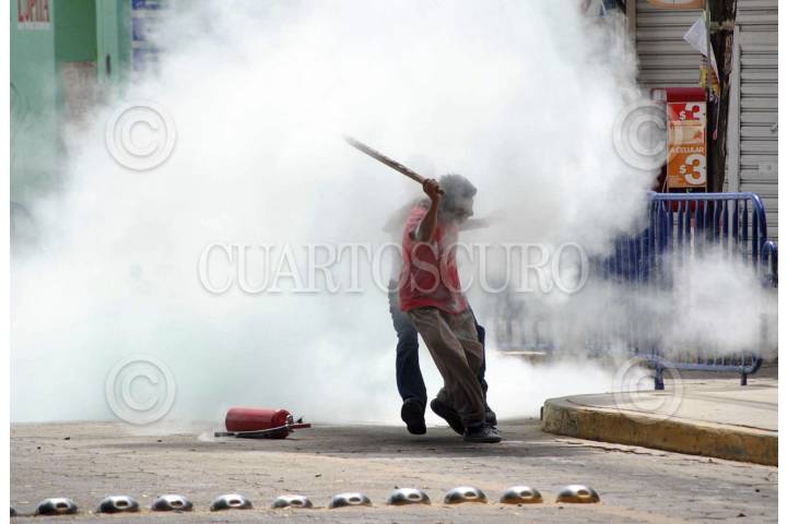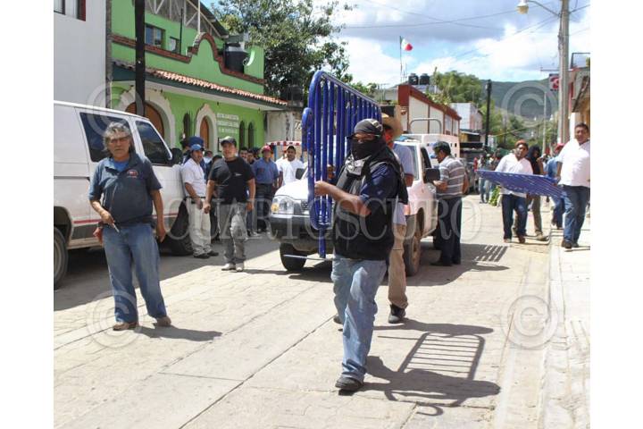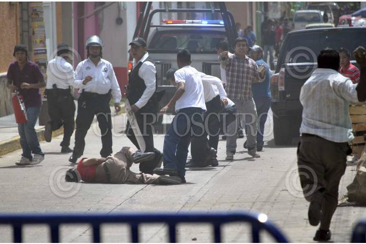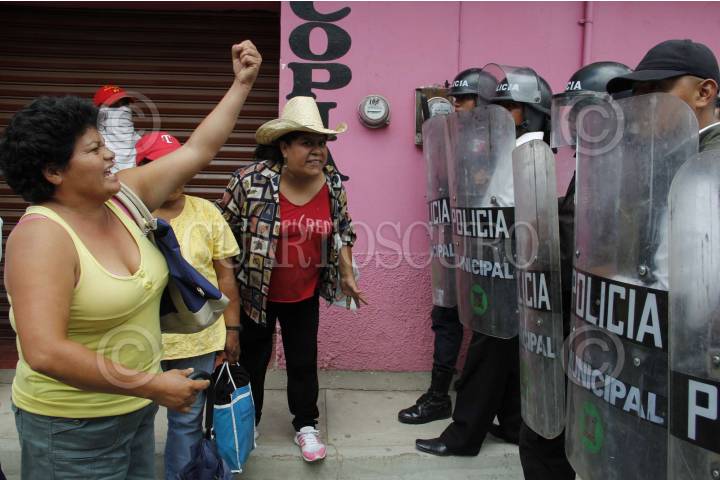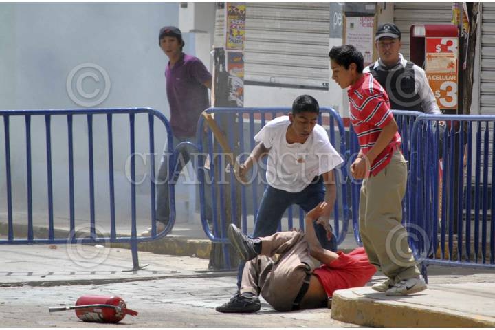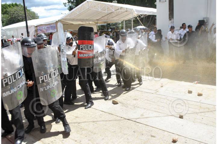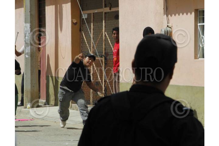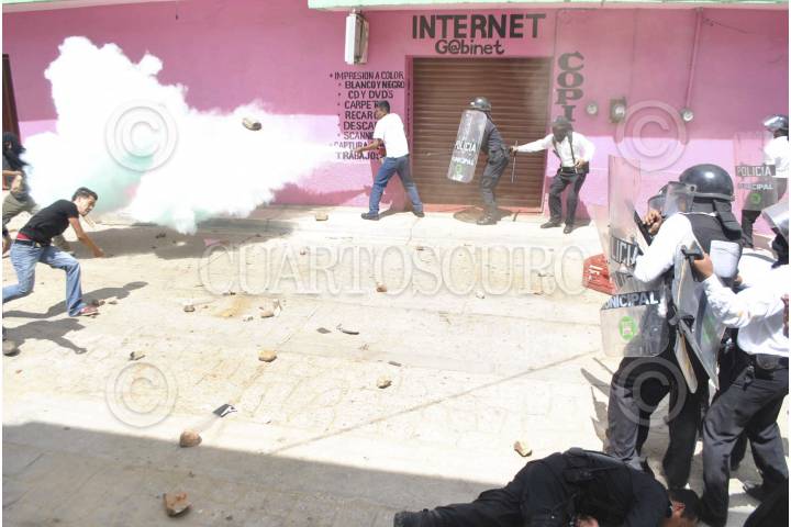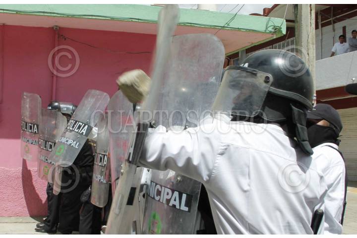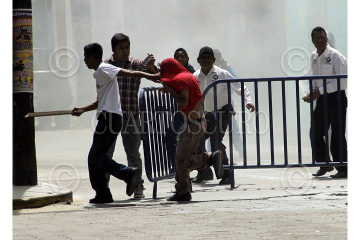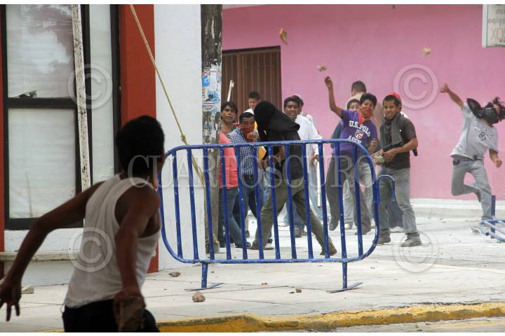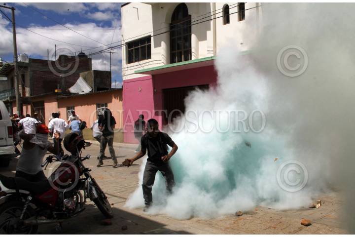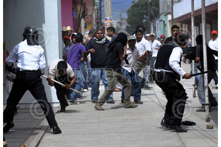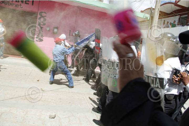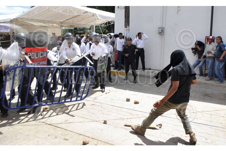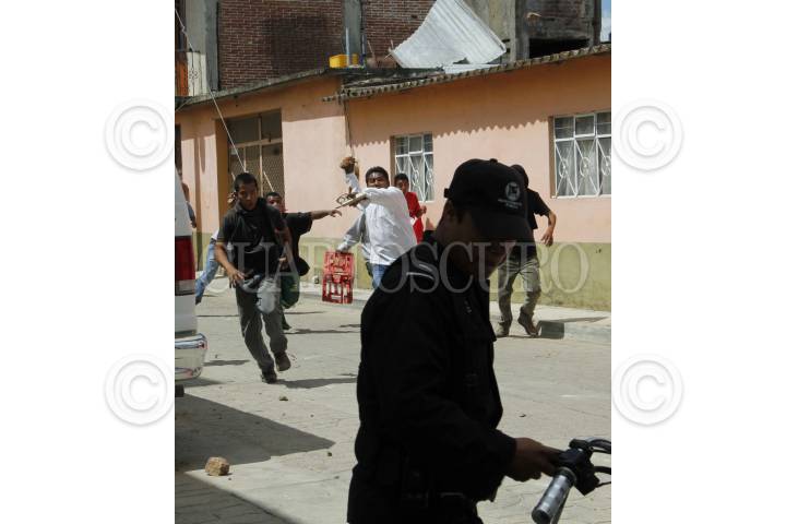 XOXOCOTLAN, OAXACA, 08OCTUBRE2012.- Integrantes del Frente Popular Revolucionario se enfrentaron con policías municipales, en la alcaldía de Santa Cruz Xoxocotlán después que los manifestantes marchaban por las calles aledañas al palacio municipal. FOTO: CARLOS SALINAS /CUARTOSCURO.COM