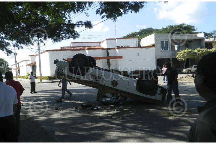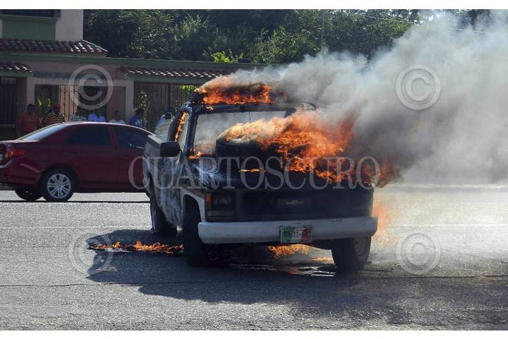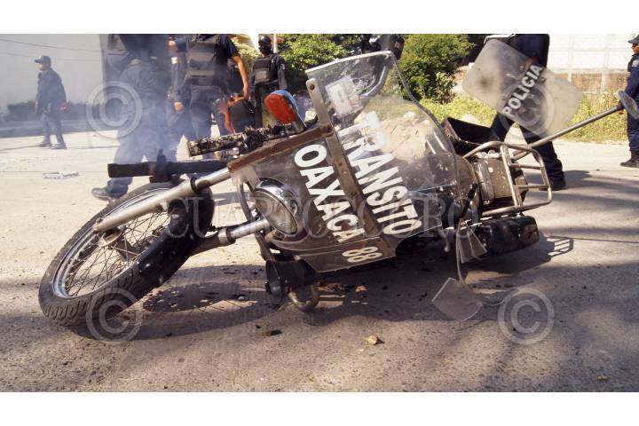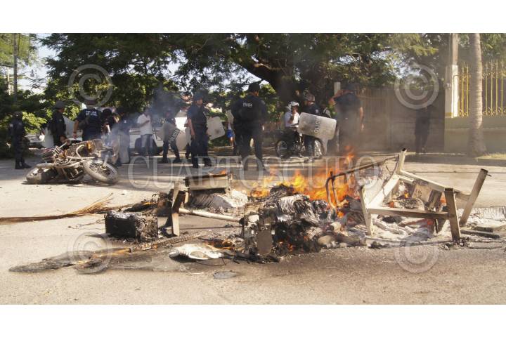 JUCHITAN, OAXACA, 25OCTUBRE.- Juchitán despertó la mañana del miércoles con un bloqueo de 100 taxistas, quienes enfurecidos con el delegado de Transito por su ineptitud y falta de establecimiento de rutas de moto taxis, incendiaron una camioneta, motocicleta e inmobiliario de esta dependencia. Ante esta situación, alrededor de 100 elementos de policía regional y municipal arribaron al lugar, para apaciguar la situación violenta que iniciaron taxistas. El líder desapareció del lugar para evitar ser detenido, mientras tanto los taxistas amenazaron con continuar bloqueando hasta que sus compañeros sean liberados y se solucione el conflicto del transporte en Juchitán ante la Secretaria de Vialidad y Transporte. FOTO: CARLOS SALINAS /CUARTOSCURO.COM