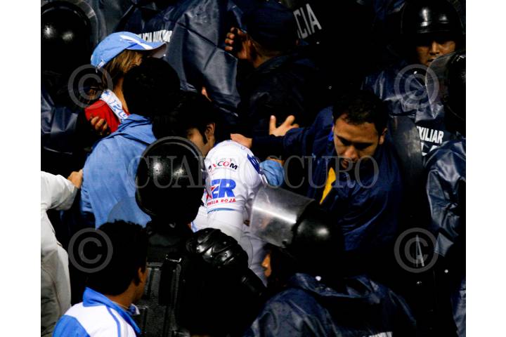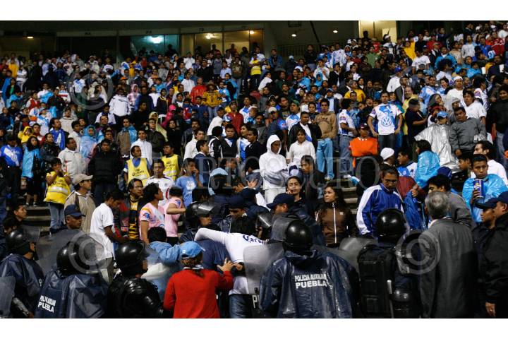 PUEBLA, PUEBLA, 21MAYO2009.- La noche de ayer, al término del partido del Puebla de la Franja contra Pumas de la UNAM, en los palcos de la afición poblana se registraron actos de violencia que inmediatamente fue controlado por elementos de la policía auxiliar que custodiaba el estadio Cuauhtémoc. FOTO: JAVIER PALACIOS/CUARTOSCURO.COM