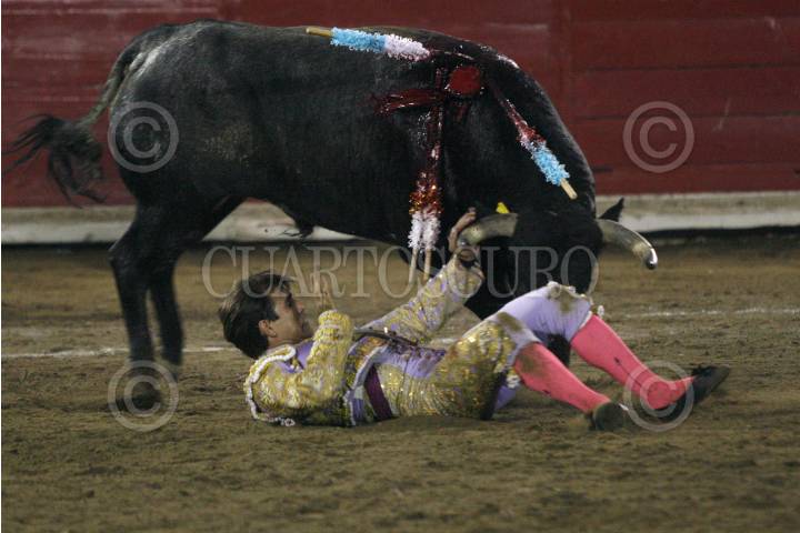 PUEBLA, PUEBLA, 23MAYO2009.- Ayer por la noche, el matador Arturo Macías "El Cejas", mientras toreaba fue envestido por uno de los 6 toros de la casa Reyes Huerta, en el encuentro mano a mano que tuvo con el tlaxcalteca Rafael Ortega, en la plaza de toros El Relicario. FOTO: JAVIER PALACIOS/CUARTOSCURO.COM