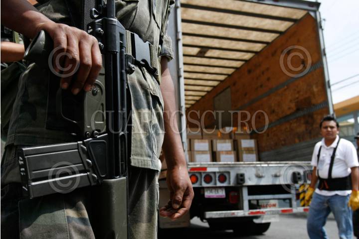 PUEBLA, PUEBLA, 10JUNIO2009.- Personal del Instituto Federal Electoral de Puebla (IFE), junto con elementos del Ejército Mexicano, recibieron en las bodegas del instituto la paquetería que será enviada a los diversos municipios y sus respectivos distritos para los comisios a una diputación federal que dicho proceso democrático se realizará el próximo 5 de julio. FOTO: JAVIER PALACIOS/CUARTOSCURO.COM