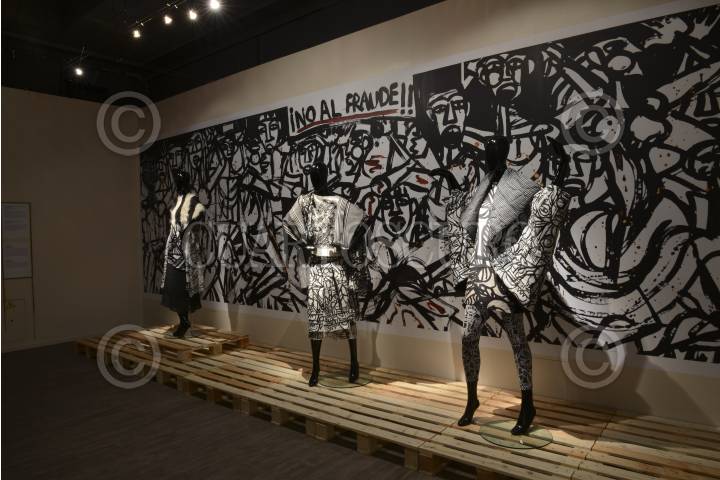 CLERMONT,FRANCIA, 15SEPTIEMBRE2016.- Sobre figuras desdibujadas que forman imaginables multitudes alcanza a verse una frase: “No al fraude”. Más allá, el fondo rojo hace resaltar los ojos profundos que miran hacia el fotógrafo anónimo que –sin saberlo– inmortalizó a uno de los 43 desaparecidos de Ayotzinapa. Pero no. No son mantas. No son algunas de las miles de imágenes plagadas de consignas que vemos desfilar en cada marcha, en cada grito, en cada clamor por justicia. Desfilan, sí, pero esta vez por las pasarelas de la moda: prendas convertidas en denuncia. Moda con causa. Surgidas de la historia del país –un fraude electoral que provocó el cansancio de tantos y la oscura desaparición de un grupo de normalistas– las colecciones hablan hoy de México a quienes pueden apreciarlas en museos y galerías… por ahora, lejos de aquí... FOTO: DANIEL CRUZ RIÓN/ ESPECIAL CUARTOSCURO.COM
