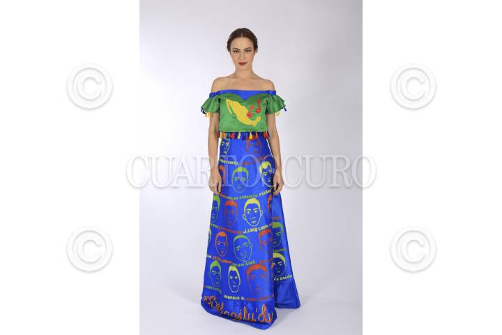 CLERMONT, FRANCIA, 15SEPTIEMBRE2016.- LA OTRA DESAPARICIÓN DE LOS DESAPARECIDOS Nadia Gómez, quien estudiaba diseño de modas en el CAM de Acámbaro, Guanajuato, decidió entrar al concurso Unimoda 2015 en Aguascalientes, cuyo tema era “Lila Downs”. Era el momento de reflejar lo que emocionalmente había significado para ella y para el país el caso Ayotzinapa. Sabía que la cantante oaxaqueña había clamado por justicia y quería que viera su vestido: una blusa en verde con un mapa del país con esperanzadoras notas musicales, y en la falda, sobre un fondo azul, los rostros y nombres de los 43 desaparecidos. En lo más bajo, la leyenda zapoteca: Bedazilu´du lii= Los recordamos... FOTO: DANIEL CRUZ RIÓN/ ESPECIAL CUARTOSCURO.COM