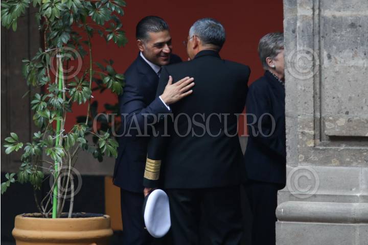 CIUDAD DE MÉXICO, 18SEPTIEMBRE2025.- Omar García Harfuch, secretario de Seguridad Ciudadana, saludó a Raymundo Pedro Morales, secretario de Marina, durante la llegada del primer ministro de Canadá, Mark Carney, a Palacio Nacional. FOTO: GRACIELA LÓPEZ/CUARTOSCURO.COM