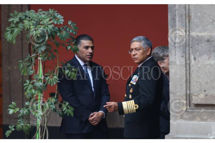 CIUDAD DE MÉXICO, 18SEPTIEMBRE2025.- Omar García Harfuch, secretario de Seguridad Ciudadana, y Raymundo Pedro Morales, secretario de Marina, conversaron durante la llegada del primer ministro de Canadá, Mark Carney, a Palacio Nacional. FOTO: GRACIELA LÓPEZ/CUARTOSCURO.COM